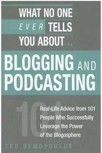 I just finished reading the fun and fast book What No One Ever Tells You About… Blogging and Podcasting by Ted Demopoulos. This is a great read for anyone looking for some encouragement and case examples of real people who blog and podcast. Unlike some books that focus on celebrity bloggers such as Bob Lutz, GM Vice Chairman and his Fast Lane blog, Ted profiles "regular people" and also spends some time on other aspects of blogging such as why you should be monitoring blogs to find out what people are saying about you and your organization and its products and services.