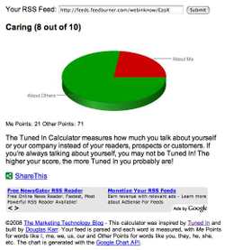 Last week, Douglas Karr released on his Marketing Technology Blog a Tuned In Calculator. The idea is deceptively simple. It takes your RSS feed and analyzes it for how often you use egocentric words like "we" and "our" compared to how often you talk about your readers, your buyers and their problems. As Douglas says, "If you're always talking about yourself, you may not be Tuned In!"