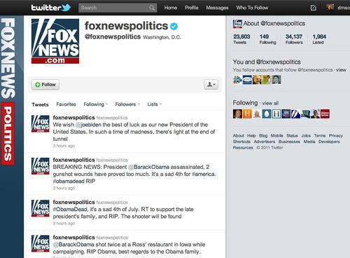 This morning, the @foxnewspolitics Twitter feed was hacked and populated with tweets reporting the death of President Obama. A group called Scriptkiddies claimed responsibility.