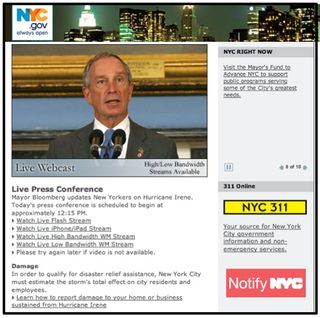 In the run up and during the peak of Hurricane Irene, Mayor Bloomberg himself delivered detailed press briefings nearly every few hours which were broadcast on the Web, television and radio. A transcript was offered. There was a sign-language interpreter. Information was also available in Spanish, sometimes delivered by the Mayor himself.