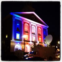 Last night I attended a Jon Huntsman town hall event in Peterborough, New Hampshire (about 60 miles from where I live near Boston). This was local campaigning at its best. A beautiful small town with the local hall decked out in patriotic colors (and with television trucks out front).