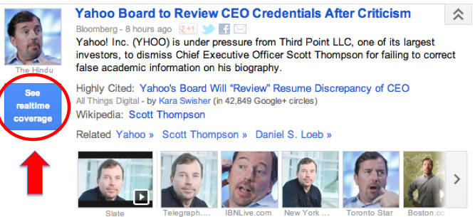 As I write this, a breaking business story this morning is about Yahoo CEO Scott Thompson and the inaccurate educational information found in his biography. Clicking over to the real-time coverage of this story shows what the latest mainstream media journalists and bloggers are saying. (Note that if you are reading this much after the breaking stories in early May 2012, you may not see any real-time news so I include screen shots in this post.)