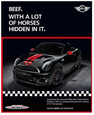 Into the furor jumps Mini with this clever ad: "Beef. With a lot of horses hidden in it."