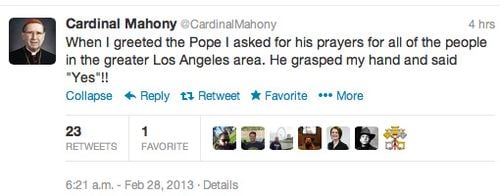 Cardinal Roger Mahony, who resigned as archbishop of Los Angeles following the release of personnel files documenting priest sexual abuse cases during his tenure, is taking advice from a crisis management firm, writing a blog and tweeting @CardinalMahony his thoughts.