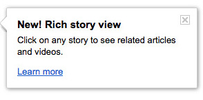 Today, I noticed Google talking up a new feature they call Google News rich story view. It takes a top headline and adds context such as images, videos, related stories, a highly cited article, opinion pieces (including blog posts), and other links.