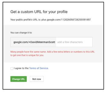 Recently when I visited my Google Plus account - +David Meerman Scott – I was greeted with a message that I could get a custom URL for my profile. My current URL plus.google.com/u/0/112026058728255591897 could be turned into a URL with my name.