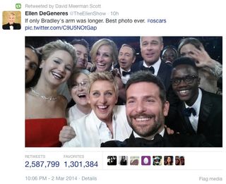 The photo brought Twitter’s servers down for about 20 minutes and by the end of the Oscars broadcast had become the most retweeted tweet ever.
