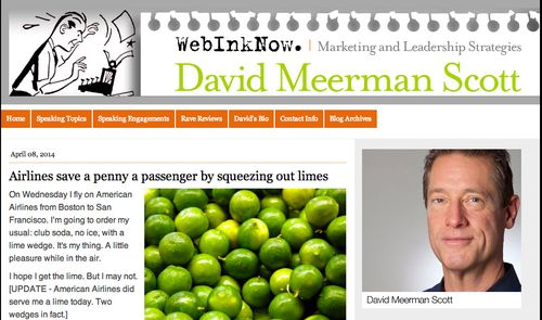 Yesterday I rolled out a new blog masthead to focus on my name David Meerman Scott rather than the blog name Web Ink Now. I also started using “Marketing and Sales Strategies” instead of “Marketing and Leadership Strategies” because sales better describes what I talk about on my blog and in my books and speeches. You can see before and after below.
