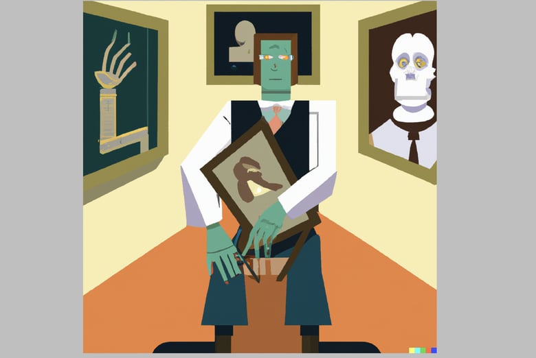 Image via Dall-E 2 from the prompt: “A Frankenstein style character inside of an art museum with framed paintings under one arm that he has stolen off the walls.”