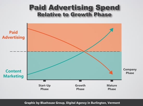 Michelle Massa at Bluehouse Group, a full service digital agency located in Burlington, Vermont, was tuned in to my HubSpot Academy Masterclass and my ideas prompted her to make this terrific graph to illustrate my point. Early stage companies may benefit from paid advertising early in their lifecycle and convert to a content marketing model over time as the business grows and matures. Read Michelle’s excellent post that elaborates on these ideas here.