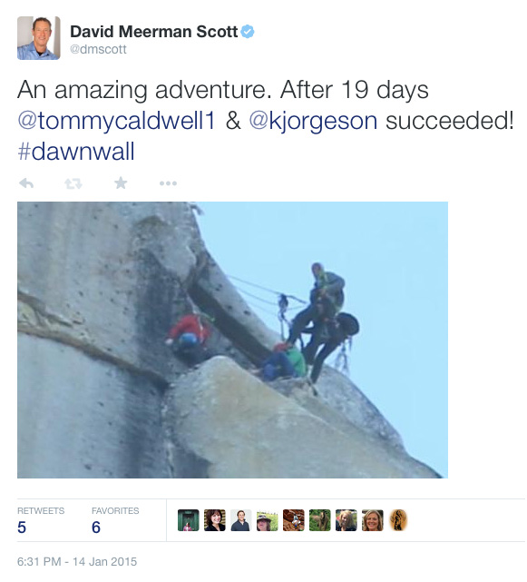 The media really got into it over the past few days. While I watched Google News yesterday during the final push to the summit, there was one story updating every few minutes and a tweet every few seconds using the #DawnWall hashtag.