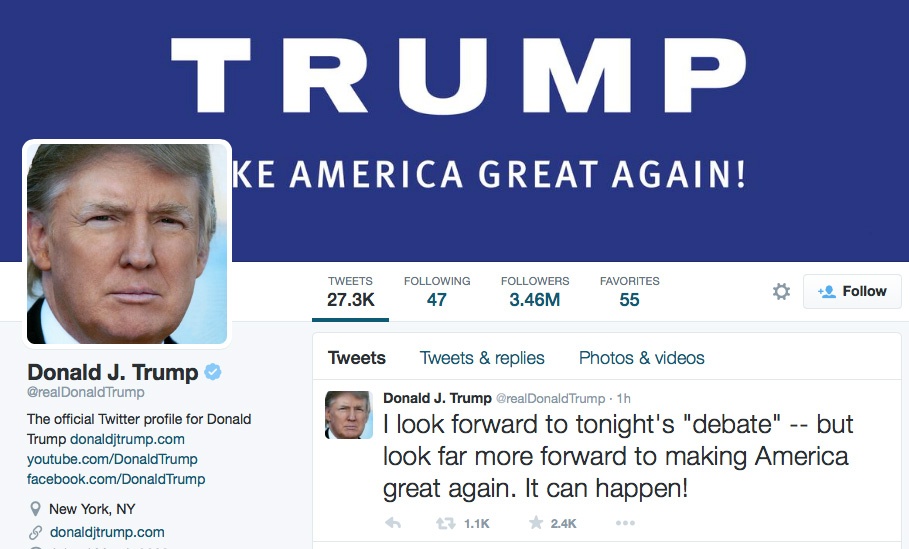 Trump has the social media chops: As I reported several days ago, Donald Trump is Winning the Social Networking Primaries in a Landslide. Donald Trump - @realdonaldtrump with 3.4 million followers - is way out in front of the pack in the number of followers. Looking at the total number of tweets as a proxy for the level of each candidates' engagement in social networking, Donald Trump has tweeted 27,300 times since he joined Twitter in 2009, which is nearly three times as many tweets as the next most prolific candidate. Tweeting from the stage would be consistent with the Trump brand of making use of Twitter to communicate in real time.