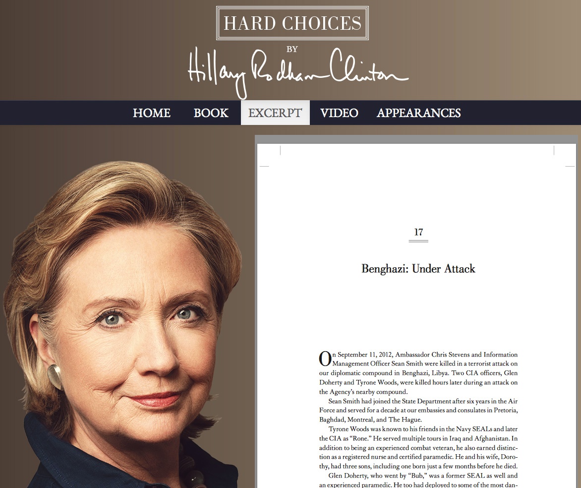 This week, Hillary Clinton and Simon & Schuster, the publisher of her 2014 memoir Hard Choices, made chapter 17 “Benghazi: Under Attack” completely free on the book’s site. All 35 pages are available with no registration required.