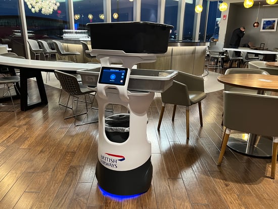 I was fascinated by a little robot working away at the British Airways lounge in Boston. What a great example of how Artificial Intelligence and Robotics can help workers.