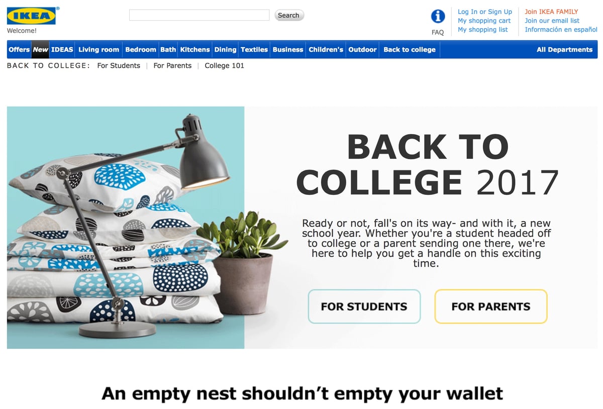 I love the Back to College 2017 microsite from IKEA. It’s a wonderful example of the concept of buyer persona based content marketing. “An empty nest shouldn’t empty your wallet. For parents and students alike, college moving day is bittersweet. But sharing the experience together is a chance to make memories.”