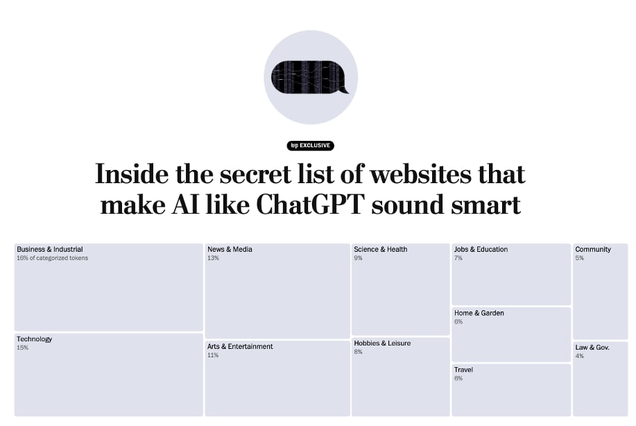 The Washington Post released a fascinating analysis of how AI chatbots gather content on the public Web. The report, Inside the secret list of websites that make AI like ChatGPT sound smart (subscription required) is a fascinating read.