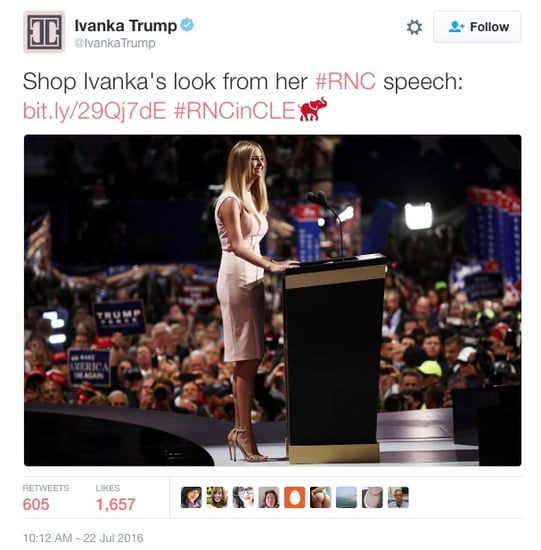 Just a few hours after introducing her father, Donald J. Trump, before his address to the delegates at the Republican National Convention last week, Ivanka Trump tweeted a photo of herself on stage with a link to a Macy's store listing of the Ivanka Trump brand Sleeveless Studded Sheath Dress like the one she was wearing.