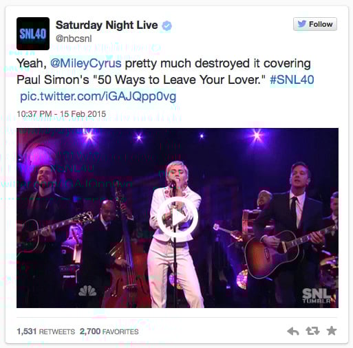 I’m so glad I caught #SNL40. There was some good stuff. But when the 50th comes around in a decade, the only thing I’ll remember of the broadcast is Miley.