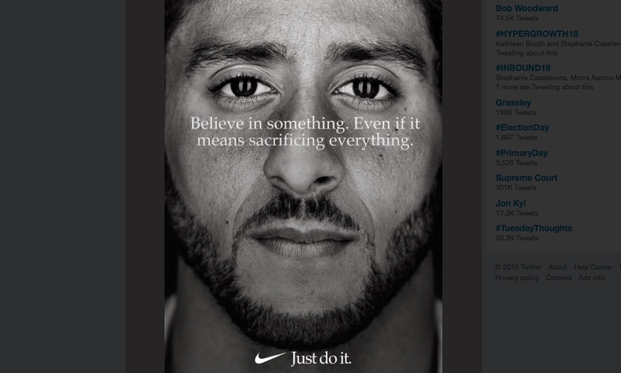 Nike stoked controversy this week with a new advertisement in the company’s ongoing “Just Do It” campaign featuring Colin Kaepernick, the NFL football player who in 2016 chose not to stand for the playing of the national anthem to protest racial injustice. The ad is a gutsy move by Nike because of the controversy surrounding Kaepernick.