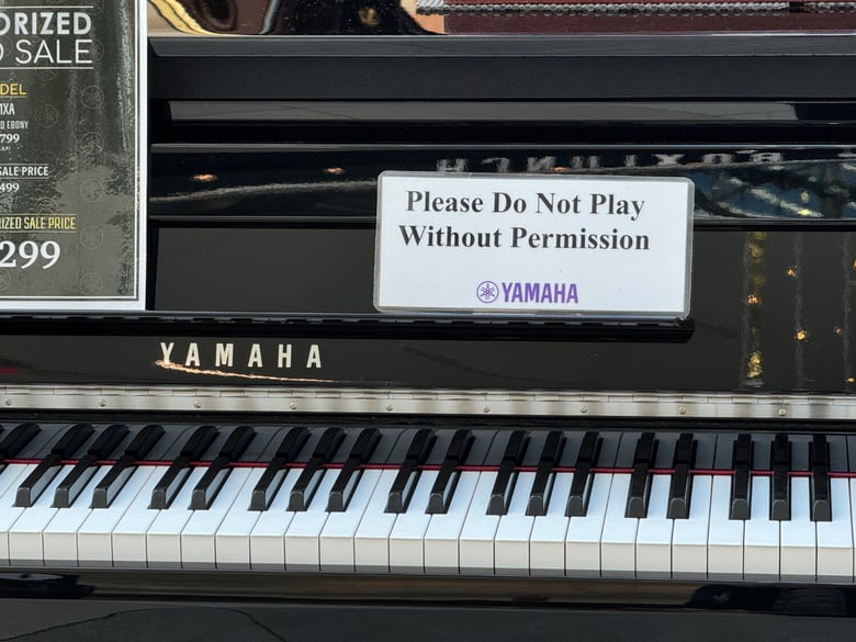 In prime real estate at my local shopping mall, a Yamaha piano dealer is actively discouraging customers. On every piano is a sign reading: “Please Do Not Play Without Permission”.