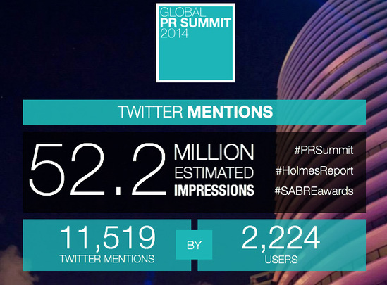 The Global PR Summit had 350 people from 25 countries attend in person but the social engagement reached many times that number of people. In fact 2,224 people tweeted a total of 11,519 times because when the 350 people in the room tweeted, some people in their network interact as well amplifying the real-time discussion way beyond the live audience.