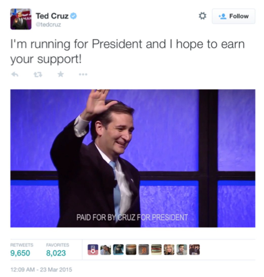 Cruz launched on March 23 by live streaming a major speech. I like that his campaign made a point to focus on the live aspects of the speech – anybody could watch via live stream - and not rely on the media to filter the content.