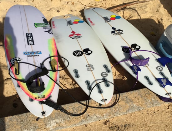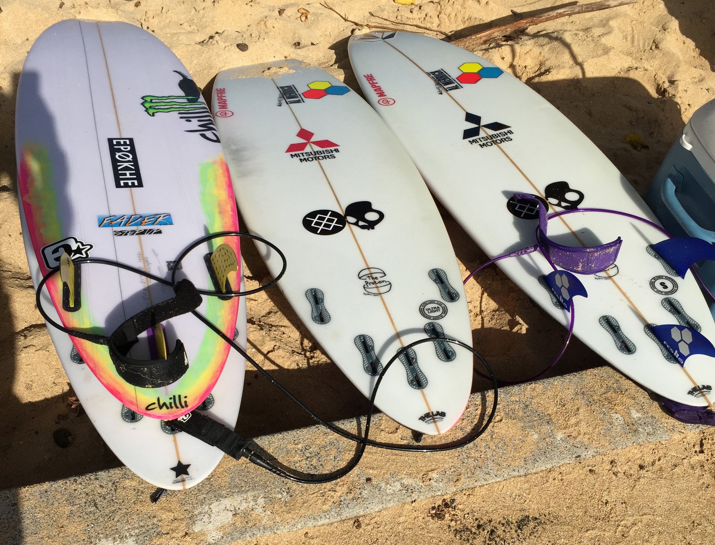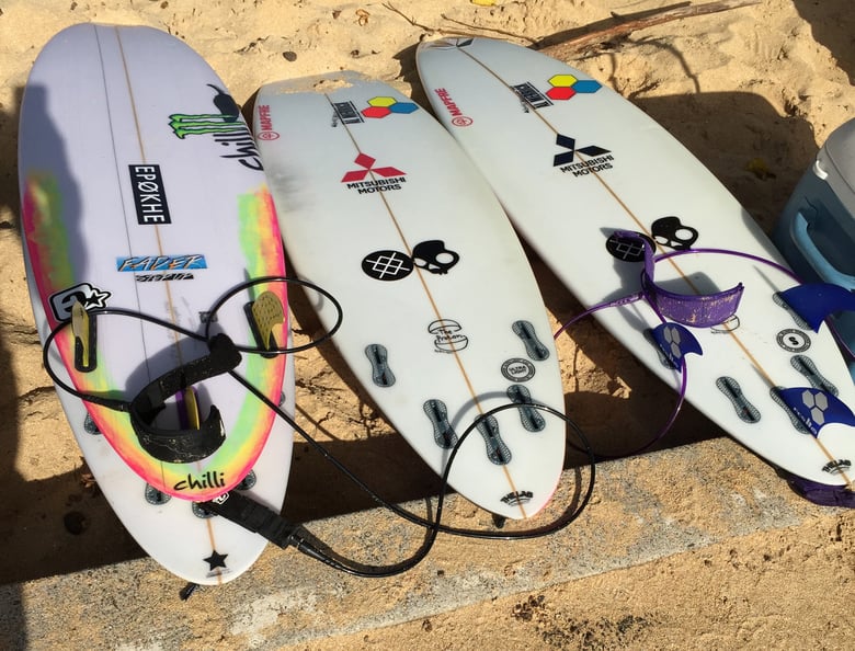 3) The sponsored surfers then wear the branded gear and use the equipment of those companies that support them. They put sponsor stickers on their surfboards.