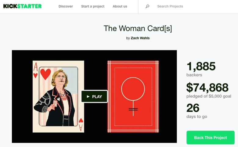 This led Zach Wahls to create a Kickstarter project a few days later to sell his deck of Women Playing Cards. He and a partner created original designs featuring prominent women including pioneers in their fields, ranging from politics to music to science to humanitarian work. The cards will include Hillary Clinton (Ace), Ruth Bader Ginsburg (King), Beyoncé (Queen) and others such as Clara Barton, Amelia Earhart, Harriet Tubman, Susan B. Anthony.