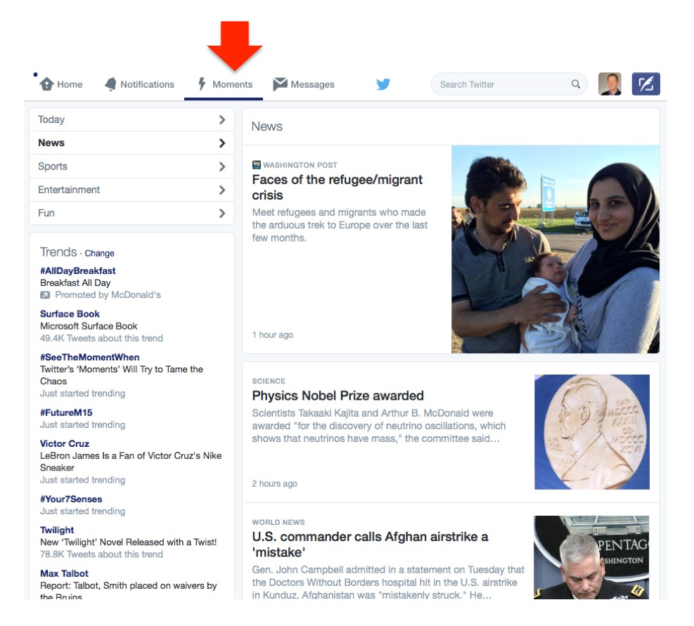 Clicking the Moments lightning bolt gets you to Twitter’s curated list of what’s important on Twitter at that moment. Within Moments are several tabs including “Today”, “News”, “Sports”, “Entertainment”, and “Fun”.